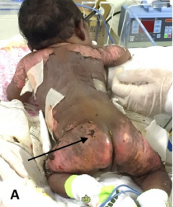 No se ha documentado la transmisión de persona a persona, pero sí se han descrito casos aislados de transmisión vertical maternofetal. En este artículo, se describe un caso de chikungunya congénito que resultó en una presentación similar al síndrome de piel escaldada estafilocócica y se analiza la presentación clínica, la fisiopatología subyacente y cómo diferenciar esta afección del verdadero síndrome de Stevens-Johnson – necrólisis epidérmica tóxica (SSJ-NET).